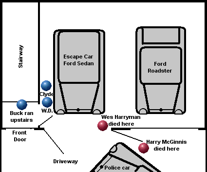 The garage played an important part in the shootout. Clyde and W.D. had returned that day due to trouble with the roadster they were driving. Buck had been out back washing his Marmon and met them at the garage. He opened the door on the East side of the garage where they then parked the Roadster. They began to transfer their guns to the Ford sedan that was parked on the West side when the law showed up. Buck went through the inside garage door to the stairway where he went up to rescue the girls. Clyde and W.D. were firing from the garage.